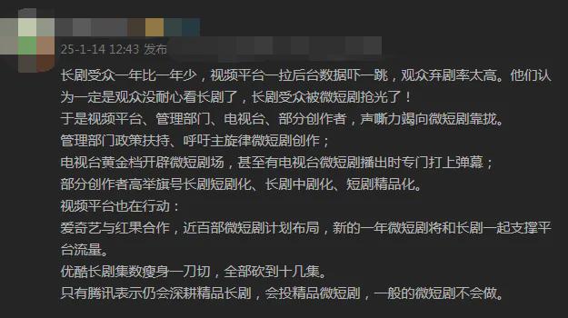 距离“2025年起优酷16集以上项目不再过会”传闻过去3个月,而马化腾在腾讯集团年会表示“短剧对长内容造成较大的冲击”,爱奇艺与红果APP合作并开通微剧频道……长剧自影视寒冬以来经历的“起起落落落落落”如今都被归结为“长剧太长”。