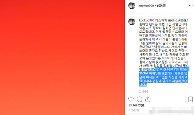 稍晚,具惠善还追加内容,称“我有结婚后在丈夫的电脑里发现的和女演员在酒店里穿着睡袍吃宵夜的照片,会作为证据向法院提交。”